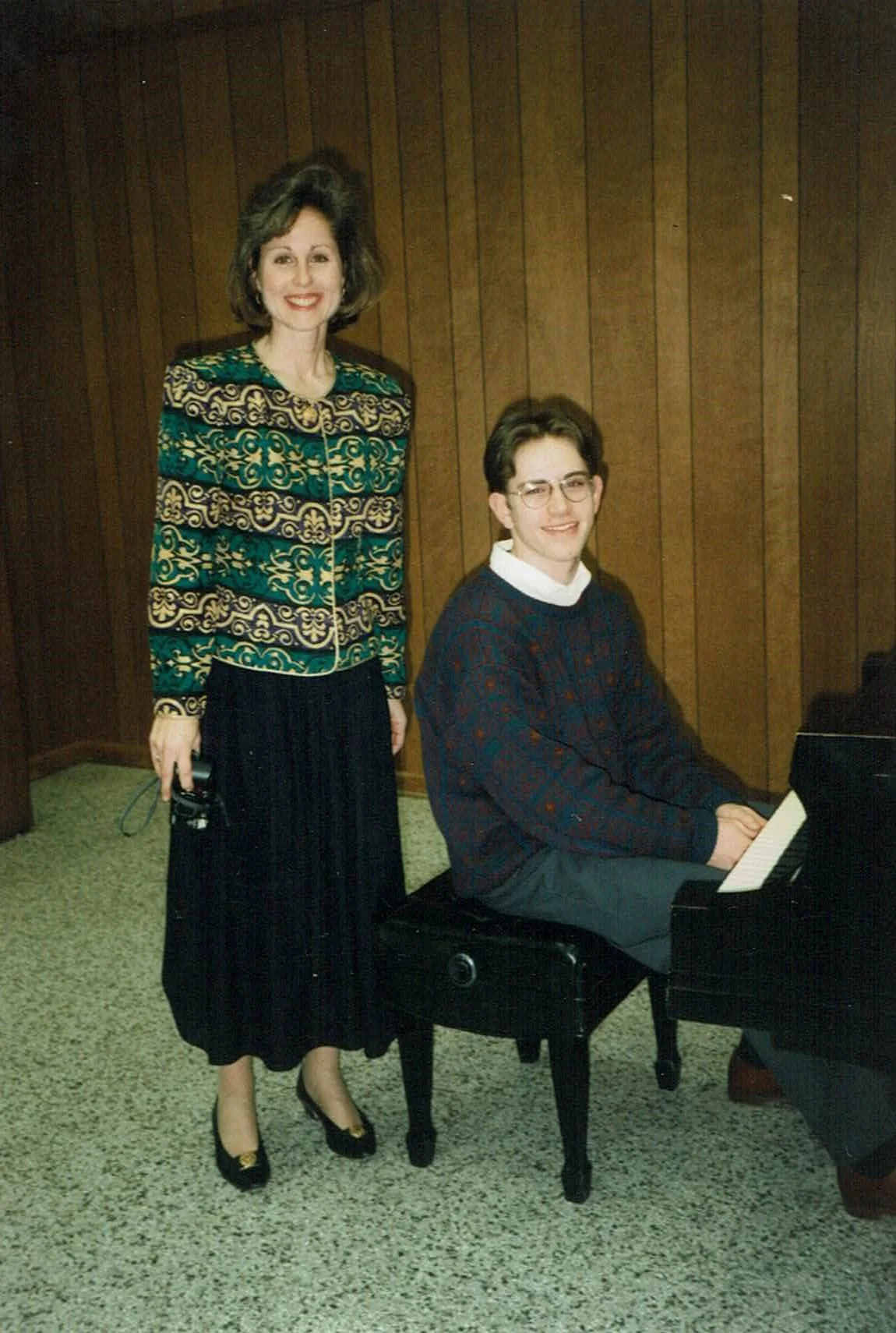 In 1997, Aaron performed in the recital following the National Piano Playing Auditions (known as Guild), where he played an unintentionally extended version of J.S. Bach’s 2-Part Invention in d minor from memory. Things were going just fine, when right near the very end, he completely blanked on the next notes…and started over at the very beginning—without missing a beat! (Thankfully, only he and his teacher Mrs. Tilson knew that it didn’t have a repeat!) The second time around, he made it to the finish line with his heart beating faster than the 16th notes on the score!